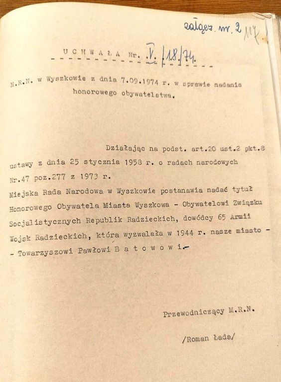 - o nadaniu honorowego obywatelstwa dla gen. Pawła Batowa, Bohatera Związku Radzieckiego, byłego dowódcy 65 Armii Frontu Białoruskiego, która w 1944 r. wyzwoliła Wyszków
